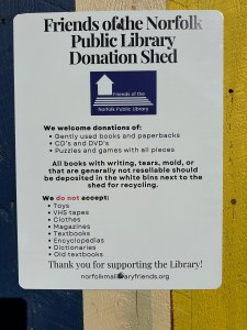 Please do not leave donations in the lobby. When the library is closed, please bring your donations to the Friends Shed at the Norfolk Transfer Station.